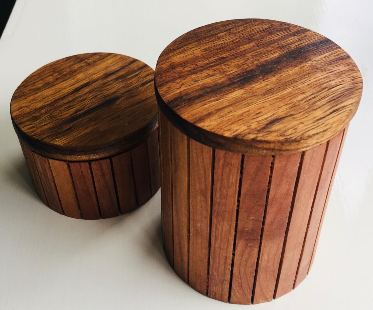 De benaming Jut en Jul geef je aan een ietwat sullig paar. Waarom die benaming nu van toepassing is op deze twee potjes? Het kwam in me op toen dat ze bij elkaar stonden en ik ernaar stond te kijken. In een werkplaats ligt er van allerlei stukjes hout. Reststukken van werkstukken die al lang geleden gemaakt zijn. Soms ruim ik op en dan sta ik ermee in mijn handen met de vraag: iets mee doen of weggooien? Er lagen wat restanten van een kersenhouten roldeur. Als je die aan elkaar gemaakte lamellen om een ronde schijf zet, dan ontstaat er een houten koker. De koker voorzie je dan van een bodem en een deksel en voilĂ  een potje. De binnenkant moet dan nog wel bekleed worden en dat is in dit geval limba fineer. De bodem en de deksel van beide potjes zijn van notenhout. Met goede olie komt de tekening van het hout prachtig naar voren. Ach en dan hebben Jut en Jul toch een zekere charme.