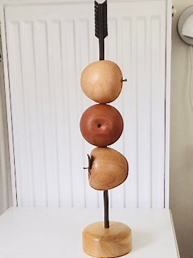 Het kunstwerk bestaat uit een pijl met drie appels, resp van Eken, Kersen en Ahornhout. Het werkstuk heeft als titel: ‘vrij naar Wilhelm Tell’ gekregen. Het is kunst met ene glimlach dat zeker op kast of tafel tot zijn recht komt!