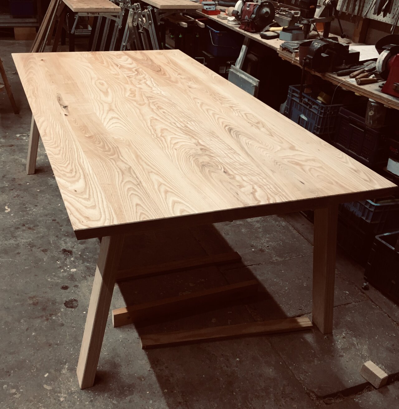het bijwerken van de berichtenbox heeft lang op zich laten wachten. Excuus , beste lezers, het is gewoon te druk. De tafel van essen hout is een behoorlijk grote tafel geworden. Met zijn lengte van 2.20 meter en breedte van 1.20 m is deze tafel duidelijk in de woonkamer aanwezig. Met een bladdikte van 45 mm weegt de tafel ook wat. De tafel maakte ik uit balkhout, die ik met messing en groef aan elkaar gelijmd heb. Het is even wat werk om alles te fresen, maar de verbinding is robuust. De poten heb ik onder een hoek van 11 graden geplaatst. De tafel kan zo maximaal, ook aan de kopeinden, gebruikt worden.