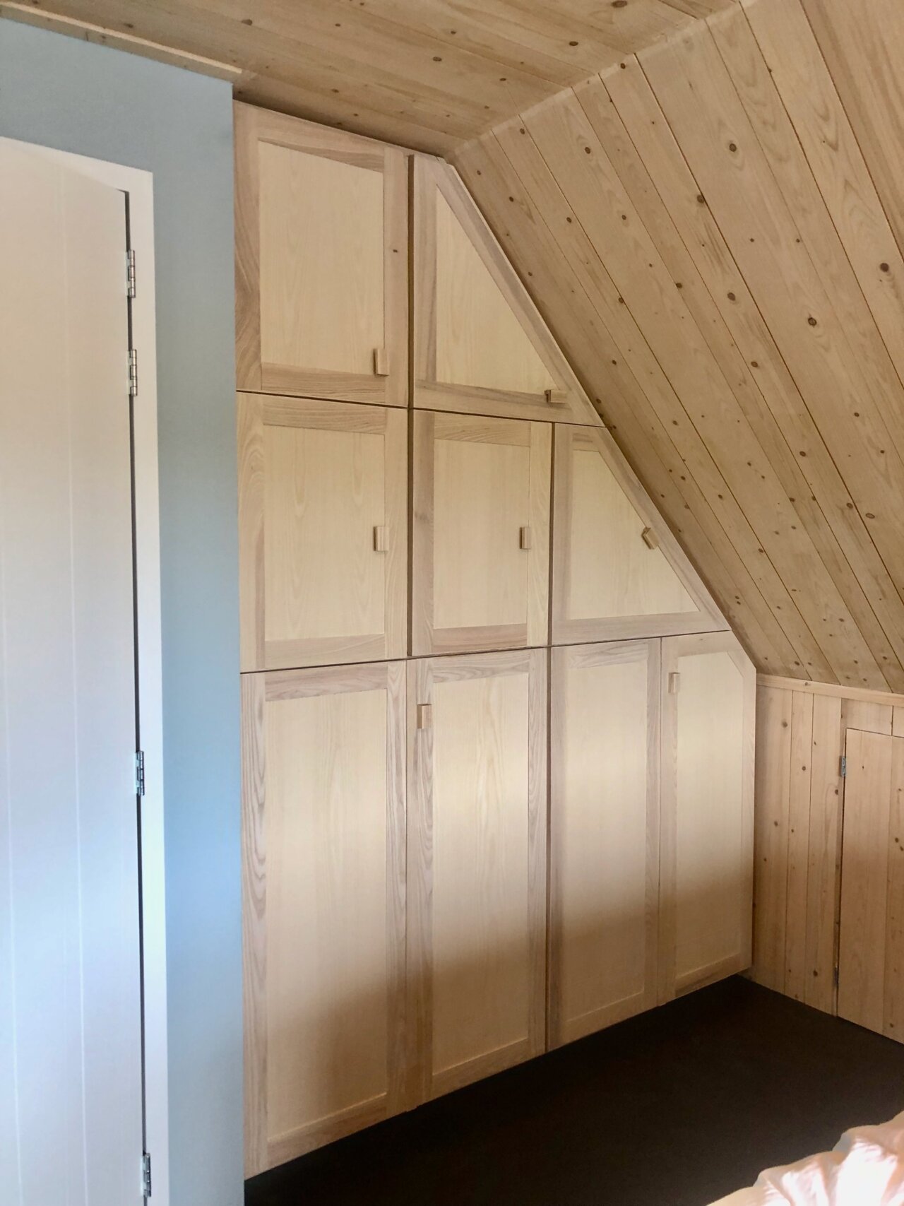 het is een simpele vraag om 4 kamerhoge kasten te bouwen. De uitwerking daarvan vraagt toch enige weken arbeid. Dit is de laatste kast uit de serie van vier. De moeilijkheidsgraad zit hem in het schuine gedeelte van de kast. Dat moet naadloos aansluiten op de bestaande schuin wand. Bovendien staat de kast tussen twee wanden geklemd. Kortom: veel meten om het precies goed te krijgen. Voor de wanden is tweezijdig gefineerd 19 mm MDF gebruikt. Om doorbuiging van de schappen te voorkomen, zijn er verstevigingsstroken ingelijmd. De deuren hebben een lijst van massief essen (65 mm) zowel aan binnen- als buitenkant om kromtrekken te voorkomen. De deuren zijn voorzien van Blum scharnieren. Het geheel is whitewash afgelakt. Al met al is het een mooi resultaat en de kast heeft veel bergruimte.