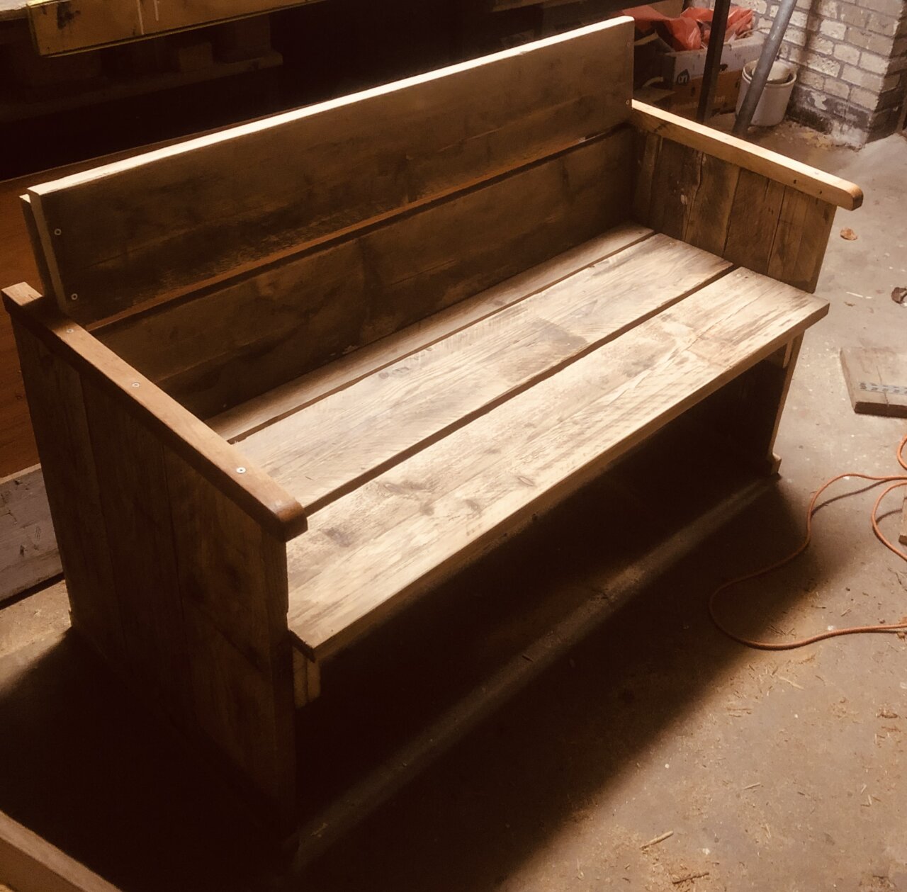 De schuurmannen beschikken over een mooie voorraad hout. Er zitten ook soorten tussen, die niet zomaar meer in de handel verkrijgbaar zijn. Denk nu niet dat de schuurmannen illegaal hout inkopen. Meestal kunnen we hier of daar wel een partij hout opduikelen, die bijna ligt te verkommeren. Dan zijn we er als de kippen bij en bekijken met onze ambachtelijke blik of er van de partij nog iets te maken is, voordat het als biomassa wordt verstookt. Dat betekent natuurlijk wel dat ons hout al een hele bewerkingsgeschiedenis achter de rug heeft, voor het ook verwerkt kan worden. Het is al eens eerder gememoreerd: hout was, is en blijft duur. Dat is de reden dat we steeds meer hout een tweede kans geven. Als er dus een partij afgekeurde steigerplanken worden aangeboden, zeggen de schuurmannen geen nee en gaan aan de slag. Dit keer wordt het een serie van drie tuinbanken. Met voeten en leuningen van eikenhout, afkomstig van een afgedankte tafel. De afmetingen kunnen vrij gemakkelijk op het internet gevonden worden: zithoogte 45 cm, breedte ca. 120 cm en zitdiepte ca. 48 cm. Steigerplanken hebben vrij standaard afmetingen: 20 cm. breed, 28 mm dik en variƫrend in lengte tot 5 meter. Het is een kwestie van zagen en schroeven. De eerste is klaar: zie foto. Nu nog een beitslaag aanbrengen om de buitenduurzaamheid wat op te krikken. Op naar de volgende!